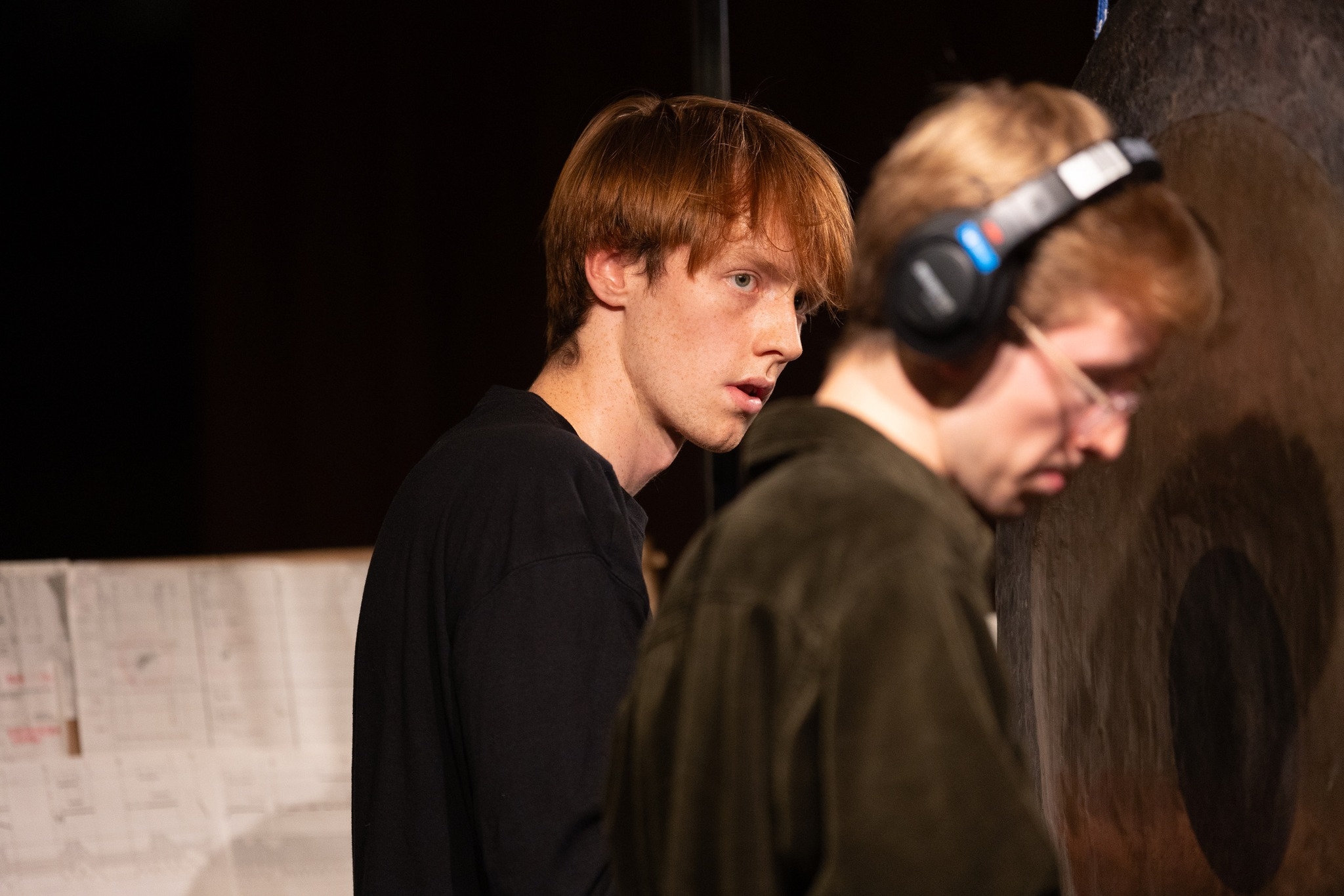 There are two types sitting over there! (POINT) They carry out a particularly important part of the piece. Using technological tools, they filter different frequency ranges and volumes in and out through the speakers. The sound they’re filtering has been captured and processed by Sebastian Lindland and Nora Sjøgren using microphones and resonance boxes—and that sound is mostly produced by me and Åsmund Soldal.